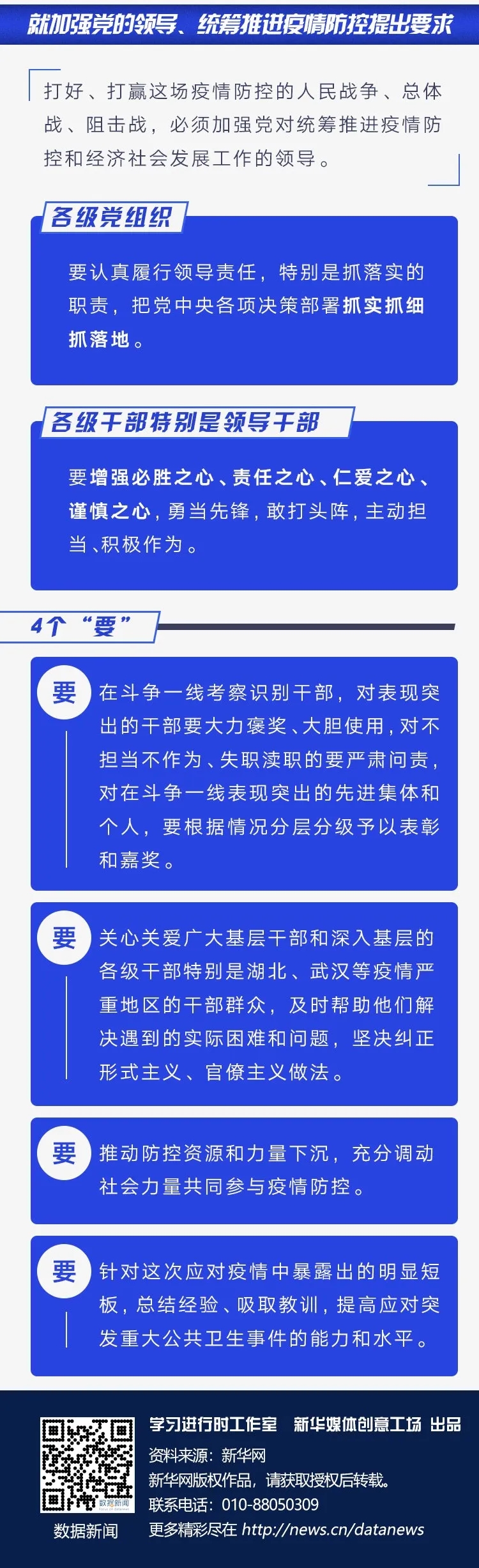 習(xí)近平指出,打好、打贏這場疫情防控的人民戰(zhàn)爭、總體戰(zhàn)、阻擊戰(zhàn),必須加強黨對統(tǒng)籌推進(jìn)疫情防控和經(jīng)濟社會發(fā)展工作的領(lǐng)導(dǎo)。各級黨組織要認(rèn)真履行領(lǐng)導(dǎo)責(zé)任,特別是抓落實的職責(zé),把黨中央各項決策部署抓實抓細(xì)抓落地。各級干部特別是領(lǐng)導(dǎo)干部要增強必勝之心、責(zé)任之心、仁愛之心、謹(jǐn)慎之心,勇當(dāng)先鋒,敢打頭陣,主動擔(dān)當(dāng)、積極作為。要在斗爭一線考察識別干部,對表現(xiàn)突出的干部要大力褒獎、大膽使用,對不擔(dān)當(dāng)不作為、失職瀆職的要嚴(yán)肅問責(zé),對在斗爭一線表現(xiàn)突出的先進(jìn)集體和個人,要根據(jù)情況分層分級予以表彰和嘉獎。要關(guān)心關(guān)愛廣大基層干部和深入基層的各級干部特別是湖北、武漢等疫情嚴(yán)重地區(qū)的干部群眾,及時幫助他們解決遇到的實際困難和問題,堅決糾正形式主義、官僚主義做法。要推動防控資源和力量下沉,充分調(diào)動社會力量共同參與疫情防控。要針對這次應(yīng)對疫情中暴露出的明顯短板,總結(jié)經(jīng)驗、吸取教訓(xùn),提高應(yīng)對突發(fā)重大公共衛(wèi)生事件的能力和水平。