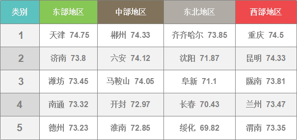前15名分別是:天津、重慶、郴州、昆明、六安、馬鞍山、齊齊哈爾、隴南、濟(jì)南、蘭州、濰坊、渭南、南通、德州、西安。