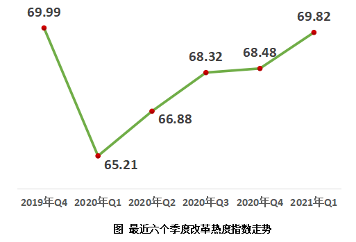 4月21日,中國經(jīng)濟體制改革研究會在京發(fā)布《2021年第一季度改革熱度第三方評估報告》。報告顯示,2021年第一季度改革熱度指數(shù)為69.82,比上一季度增加1.34,連續(xù)4個季度保持穩(wěn)定回升態(tài)勢;比去年同期增加4.61,已經(jīng)基本接近疫情前2019年第4季度69.99的水平。