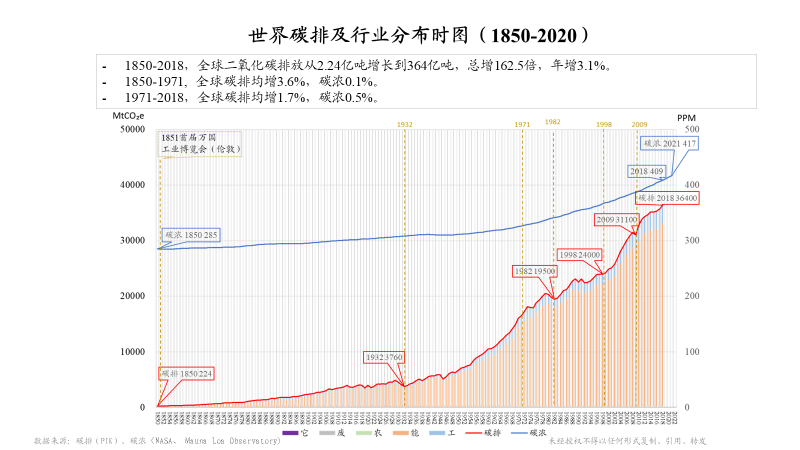 另外,我有兩張圖跟大家分享一下,也是和這個(gè)題目相關(guān)的。這張圖上面藍(lán)線是對(duì)我們環(huán)境長(zhǎng)期的一個(gè)觀測(cè),二氧化碳濃度水平。在夏威夷的莫納羅亞島,從1958年開始有持續(xù)性的觀測(cè),在此之前通過南極冰雪的資料,可以一直追溯到1850年(285PPM)。很有意思1851年全世界第一次工業(yè)博覽會(huì)在倫敦召開,也是一個(gè)工業(yè)時(shí)代到來的標(biāo)志。經(jīng)過這么長(zhǎng)時(shí)間的工業(yè)革命,現(xiàn)在可以看到二氧化碳水平已經(jīng)達(dá)到417PPM。底下這條紅線,是我們自工業(yè)革命以來的全球碳排放,可以看出明顯增速加快。