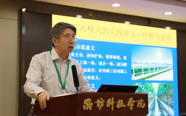 壽光市人大常委會副主任、濰坊科技學(xué)院校長李昌武在致辭中表示,濰坊市委副書記、壽光市委書記林紅玉同志在全市三級干部會議上,對我校提出全面提升辦學(xué)水平,提高社會服務(wù)能力,加快推進(jìn)碩士點培育建設(shè)的要求。為落實林書記講話要求,加強區(qū)域經(jīng)濟和“壽光模式”研究,壽光市人民政府與中國經(jīng)濟體制改革研究會等聯(lián)合成立的“新時代鄉(xiāng)村振興與區(qū)域經(jīng)濟發(fā)展研究院”掛靠學(xué)院,引進(jìn)了大批高層次人才,形成了一批富有創(chuàng)造性、建設(shè)性的學(xué)術(shù)研究成果和決策咨詢意見,“壽光模式”研究成果在國家發(fā)改委《改革內(nèi)參》刊發(fā)。成立了國家二級學(xué)會農(nóng)學(xué)思想與《齊民要術(shù)》研究會,連續(xù)成功舉辦了10屆中華農(nóng)圣文化國際研討會,師生原創(chuàng)52集動畫片《農(nóng)圣賈思勰》在中央電視臺和山東衛(wèi)視播出。學(xué)校組建了博士、教授農(nóng)學(xué)科研服務(wù)團隊,成立了蔬菜產(chǎn)業(yè)學(xué)院、農(nóng)業(yè)技術(shù)培訓(xùn)基地,自主研發(fā)蔬菜品種28個,在全國7個省區(qū)建立了育種基地,開發(fā)運營了壽光市農(nóng)業(yè)智慧監(jiān)管服務(wù)公共平臺,打造了覆蓋設(shè)施農(nóng)業(yè)全產(chǎn)業(yè)鏈的專業(yè)服務(wù)體系,為創(chuàng)新提升“壽光模式”和鄉(xiāng)村振興戰(zhàn)略的實施提供了有力支撐。