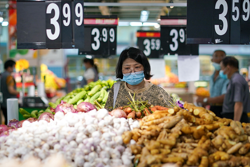 市民在江蘇省無錫市經(jīng)開區(qū)華潤萬家超市購物(2022年7月7日攝)。江蘇省無錫市在做好疫情防控的同時,積極制定相關(guān)方案,制作城市保供地圖,組織大型商超、市場正常運營,全力保供穩(wěn)價,端穩(wěn)市民“菜籃子”。新華社記者 李博 攝