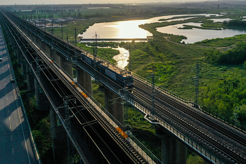 重載列車行駛在大秦鐵路上(2022年7月16日攝,無人機(jī)照片)。為做好迎峰度夏能源保供工作,中國鐵路太原局集團(tuán)有限公司在確保運輸安全的前提下全力提升煤炭運量。新華社記者 曹陽 攝