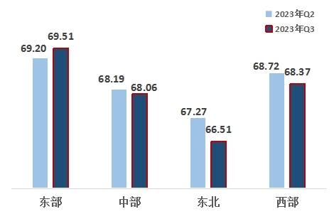 東部、西部、中部、東北地區(qū)指數(shù)分別為69.51、68.37、68.06、66.51。區(qū)域改革熱度指數(shù)呈適當?shù)牡赜蛱卣鳎瑬|部地區(qū)領先,西部地區(qū)排名第二,且連續(xù)六個季度超越中部地區(qū),東北地區(qū)最后。與上一季度相比,東部地區(qū)改革熱度指數(shù)有所上升。