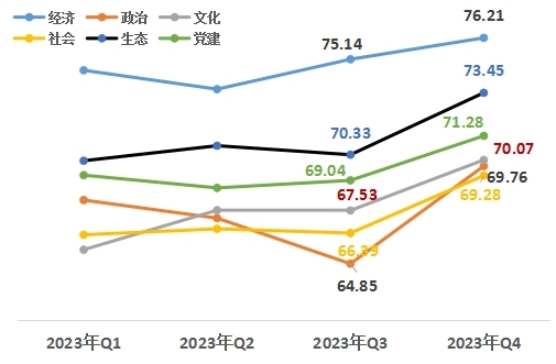 從改革熱度指數(shù)的六大領域來看,經(jīng)濟領域76.21,政治領域69.76,文化領域70.07,社會領域69.28,生態(tài)領域73.45,黨建領域71.28。與上一季度相比,六大領域均有上升,政治領域升幅最高,經(jīng)濟領域升幅最低。