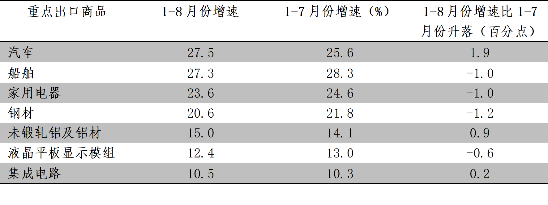 1-8月份,累計(jì)出口數(shù)量增長速度超過10%的重點(diǎn)商品共有7類,與1-7月份持平,其中3類增速回升,4類增速回落,即汽車出口增長27.5%,船舶出口增長27.3%,家用電器出口增長23.6%,鋼材出口增長20.6%,未鍛軋鋁及鋁材出口增長15.0%,液晶平板顯示模組出口增長12.4%,集成電路出口增長10.5%。