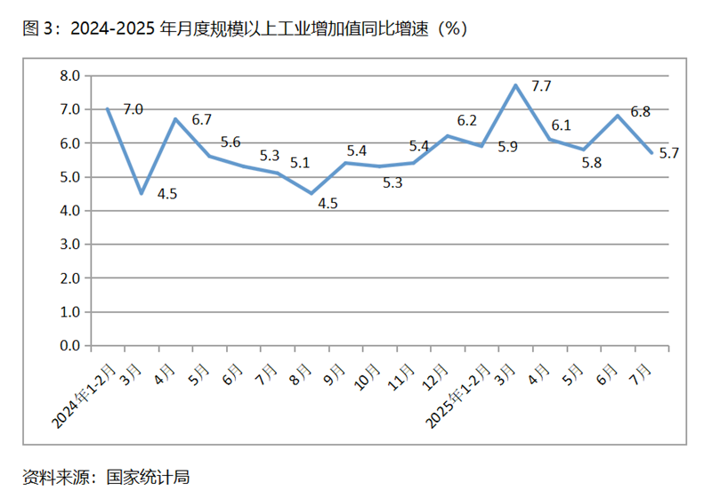 (一)工業(yè)增速由升轉(zhuǎn)落。7月份,規(guī)模以上工業(yè)增加值同比增長(zhǎng)5.7%,比上月增長(zhǎng)6.8%回落了1.1個(gè)百分點(diǎn),6月份比5月份回升了1.0個(gè)百分點(diǎn)。從工業(yè)三大門類看,采礦業(yè)和制造業(yè)增速比上月回落,電力、熱力、燃?xì)饧八a(chǎn)和供應(yīng)業(yè)增速回升,7月份采礦業(yè)同比增長(zhǎng)5.0%,比上月回落1.1個(gè)百分點(diǎn);制造業(yè)增長(zhǎng)6.2%,比上月回落1.2個(gè)百分點(diǎn);電力、熱力、燃?xì)饧八a(chǎn)和供應(yīng)業(yè)增長(zhǎng)3.3%,比上月回升1.5個(gè)百分點(diǎn)。今年以來(lái)工業(yè)增速波動(dòng)的運(yùn)行,反映出工業(yè)的回升仍缺乏穩(wěn)固的基礎(chǔ)。