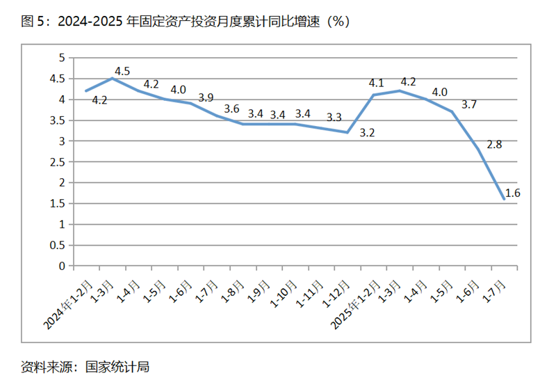 (三)投資增速持續(xù)回落。1-7月份,固定資產(chǎn)投資同比增長(zhǎng)1.6%,比1-6月份增長(zhǎng)2.8%回落了1.2個(gè)百分點(diǎn),1-6月份增速比1-5月份增長(zhǎng)3.7%回落了0.9個(gè)百分點(diǎn),增速呈現(xiàn)出持續(xù)的回落。1-7月份國(guó)有控股投資同比增速比1-6月份回落1.5個(gè)百分點(diǎn);民間投資降幅擴(kuò)大了0.9個(gè)百分點(diǎn)。三次產(chǎn)業(yè)投資中,第一產(chǎn)業(yè)投資增速回落0.9個(gè)百分點(diǎn),第二產(chǎn)業(yè)投資增速回落1.3個(gè)百分點(diǎn),第三產(chǎn)業(yè)投資降幅擴(kuò)大1.2 百分點(diǎn)。固定資產(chǎn)投資增速較大幅度的持續(xù)回落,需引起宏觀調(diào)控的高度重視。