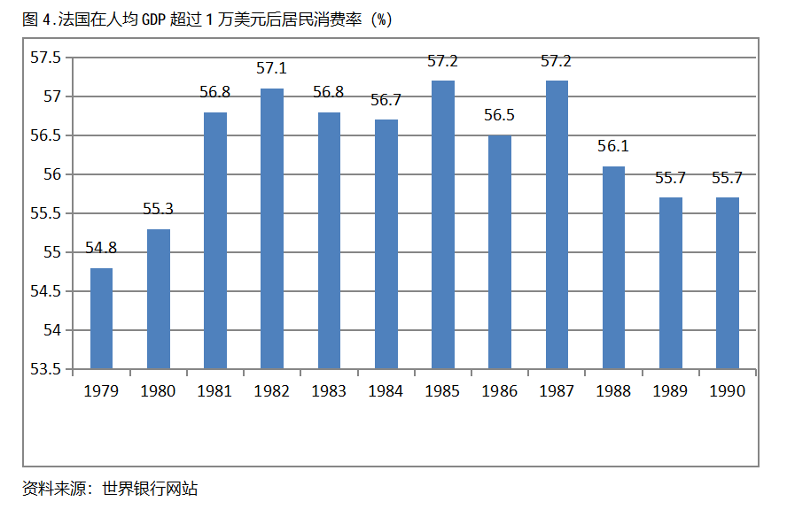法國(guó)在人均GDP超過1萬美元后的12年期間,居民消費(fèi)率一直保持在54.0%以上,同時(shí)也呈現(xiàn)出先提高后回落總體穩(wěn)定的趨勢(shì)。法國(guó)在1979年人均GDP超過1萬美元,當(dāng)年居民消費(fèi)率為54.8%,1985提高到57.2%,隨后又有所回落,1990年為55.7%,也就是說,法國(guó)在人均GDP超過1萬美元后的12年期間,居民消費(fèi)率由當(dāng)年的54.8%提高到1985年最高的57.2%,共提高了2.4個(gè)百分點(diǎn)。